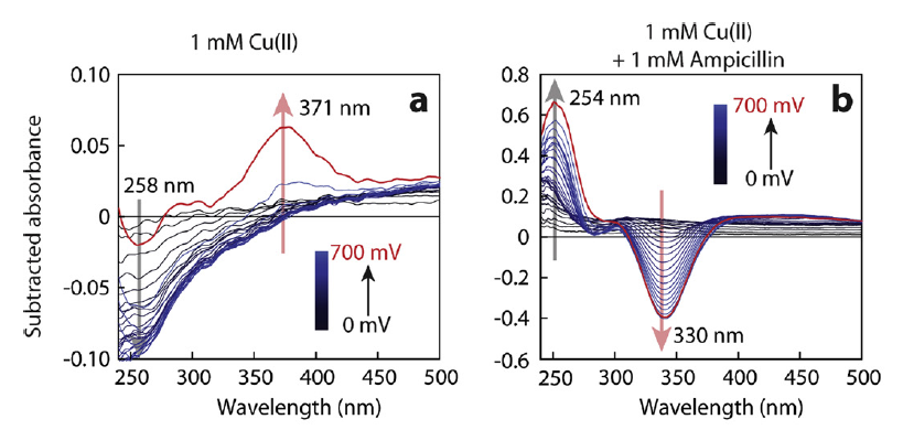 SPECE光谱电化学综合系统测试表明Cu(OH)2纳米线表面的Cu(OH)yx-在Cu(III)-抗生素中间体生成过程中起到了活性位点的作用,并且可以通过Cu(II)-抗生素中间体的形成和消解实现再生。进一步测试表明,可以通过对活性位点进行电氧化破坏细菌。该研究成果为废水中抗生素的去除提供了一种简便、低成本的方法。